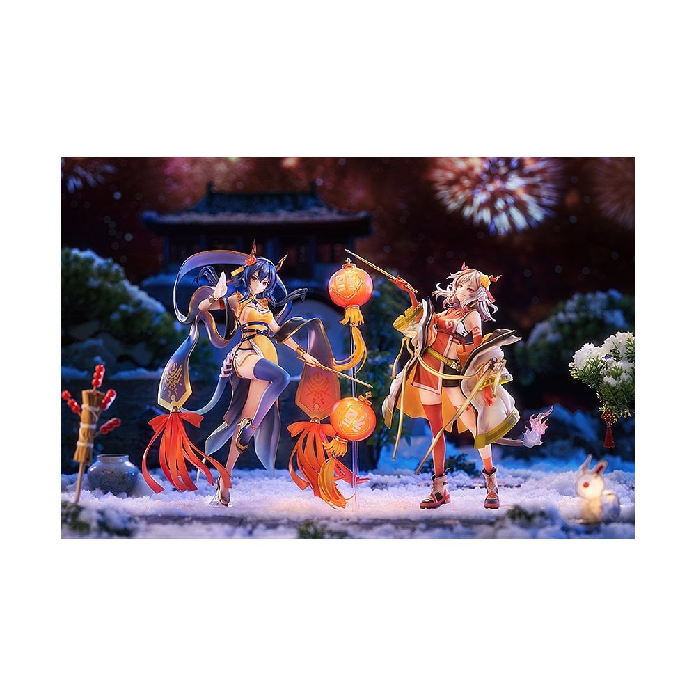 "Hold still! I'm making you a little something for your ear. It'll look great, just don't move!"From the popular smartphone game "Arknights" comes a scale figure of Nian in a special outfit for the Lunar New Year.The outfit, chosen by Nian on a whim, is a perfect fit for her! Based on her expression, it looks like she is enjoying the new year, too!The figure's base, similar to the one included with Ch'en: Spring Festival VER., features an upside-down "fu" character, a symbol meant to bring good fortune to every Doctor in the new year!Her lantern can also be displayed lit up. Be sure to add her to your collection, and welcome the new year with Nian!Display with Ch'en: Spring Festival VER. (sold separately) for an even more exciting new year!*This product does not come with a light bulb. please install a commercially available light bulb in the lantern part to use the light-up effect.