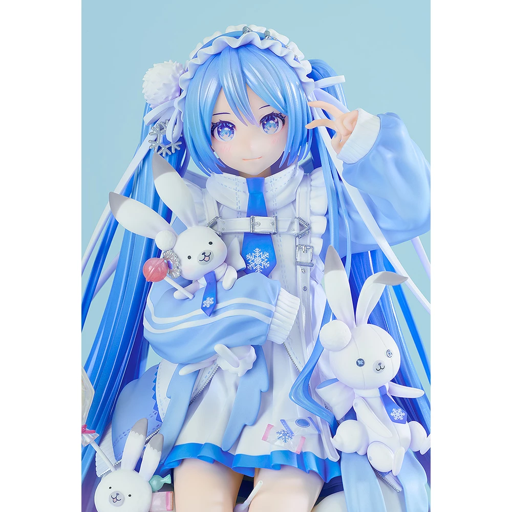 From "Character Vocal Series 01: Hatsune Miku" comes a 1/7 scale figure of Snow Miku based on her appearance from the Sky Town 10th anniversary illustration by iXima! Snow Miku has been carefully captured in figure form sitting atop a fluffy cushion, alongside Rabbit Yukine and other adorable accessories. Her snow globe-like eyes and delicately crafted pearlescent hair make for a figure that can be enjoyed from a variety of angles. Be sure to add this commemorative Snow Miku to your collection!