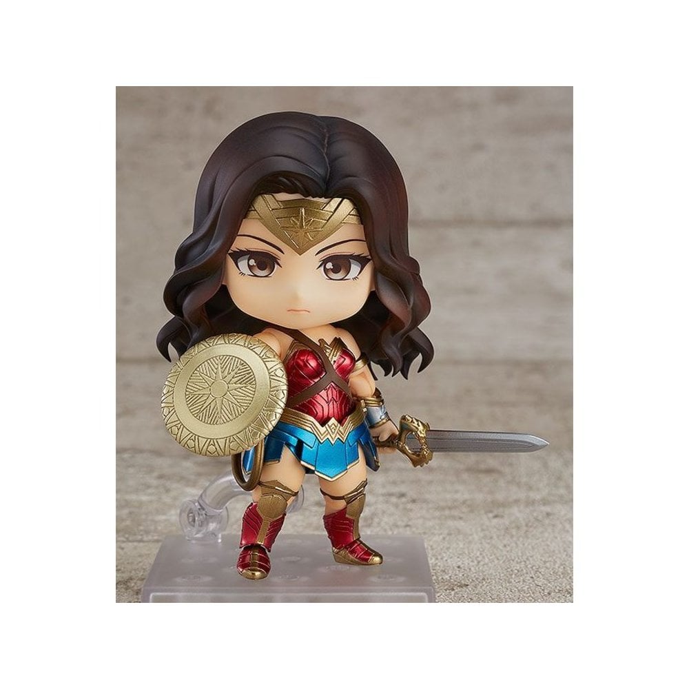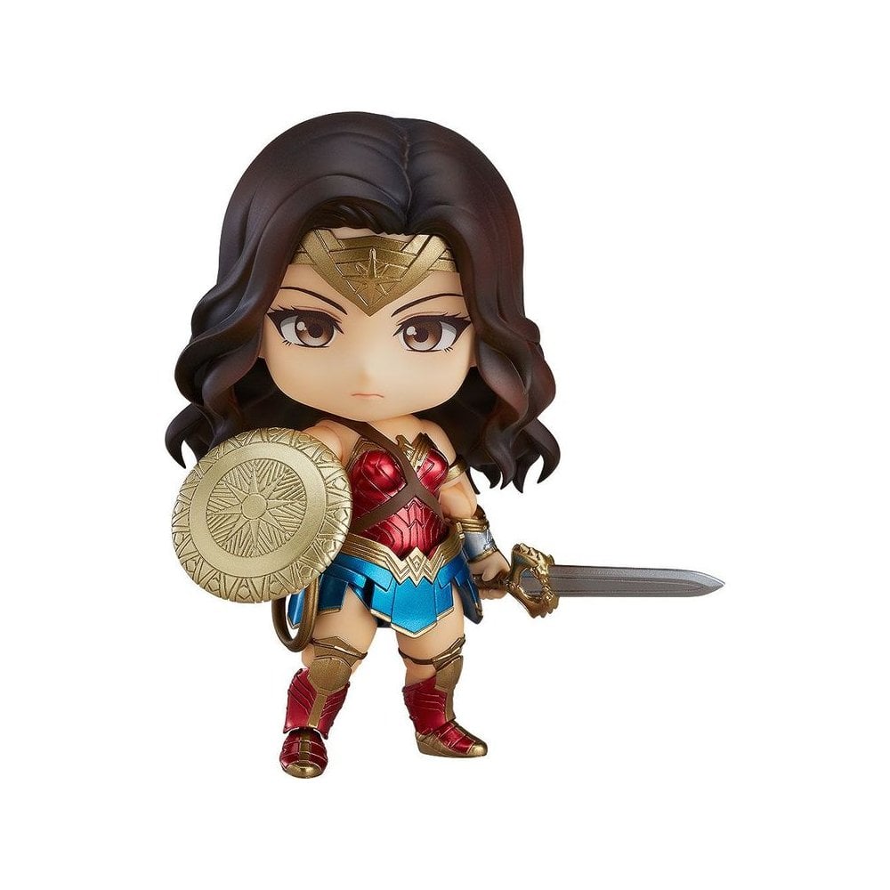Cute, small and ready to kick some ass!From the hit movie "Wonder Woman" comes a Nendoroid of the most powerful female super hero ever - Wonder Woman herself! The newly designed sword and shield from the movie are both included and can be displayed attached to her back with special attachment parts, and can also be wielded for all sorts of action poses made possible by the fully articulated joints!The famous pose from the movie where she has both arms crossed in front of her can also be recreated with the Nendoroid using specially included arm parts which have been painted with a glowing effect to fully recreate the scene from the movie.The Lasso of Truth on her hips can be removed, and she comes with a different lasso part to display her holding the weapon as well. She comes with both a standard composed expression as well as a face plate with gritted teeth for combat scenes. Simply select pose that you think suits her best and enjoy the company of the wondrous hero in your collection!