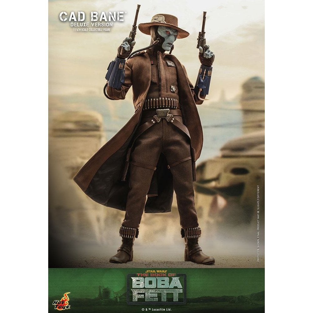 A ruthless bounty hunter from the planet Duroâ„¢, Cad Bane was the preeminent blaster-for-hire in the galaxy at the time of the Clone Warsâ„¢ and after the conflict ended. Using an impressive arsenal of weapons, the cold, cruel, and calculating Bane would literally track his prey to the ends of the galaxy if required. Following his first live-action appearance in The Book of Boba Fett, Sideshow and Hot Toys are excited to present the deadly mercenary in the Cad Bane (Deluxe Version) Sixth Scale Figure! This Star Wars collectible figure features a newly developed head sculpt with amazing likeness, skillfully tailored hat and outfit, wired long coat, a pair of blaster pistols, a flamethrower effect, and a display base.This Deluxe Version of the Cad Bane figure exclusively includes a pair of rocket thrusters for Cad Bane's boots, and the bounty hunter's techno-service droid Todo 360 as seen in the Star Wars: The Clone Wars animated series. Now it's a great time to have this infamous bounty hunter in your Star Wars collection!