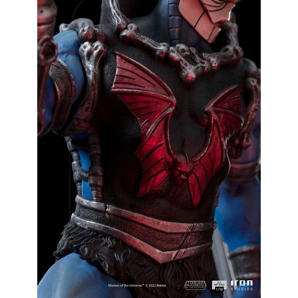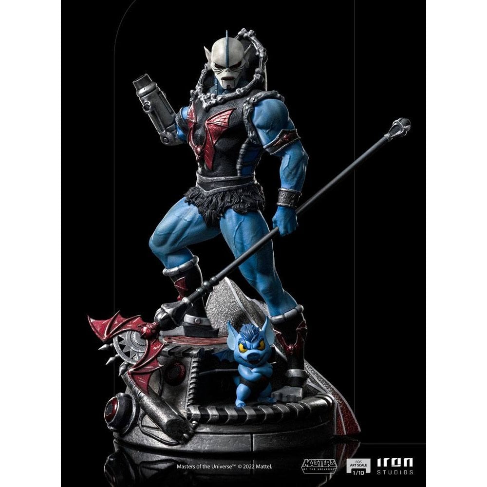 Getting his power from the symbiotic fusion between mysticism and technology, the despot and tyrant villain from planet Etheria expresses his villainy, rage, and impatience by raising his right hand with curved fingers while climbing the metallic floor of his technoindustrial base of operations in the Fright Zone. By his side is his mascot Imp, next to his metal duck feet, a small blue creature with the features of a boar combined with a bat, that has shapeshifting powers, useful to disguise and spy on his rebel enemies. Wielding a staff with the Horde's red bat symbol on the tip, Iron Studios proudly present the statue "Hordak Deluxe - Masters Of The Universe - Art Scale 1/10", with the leader of the Evil Horde, one of the main villains from the Masters of the Universe franchise, and greatest arch-enemy of She-Ra, He-Man's twin sister.Ruling planet Etheria with an army of Horde soldiers, Hordak is the main antagonist of the animated series "She-Ra: Princess of Power" by Filmation. A warlord in the old Eternia, Hordak saved Keldor's life and transformed him into Skeletor in the past, becoming his mentor, but differently from his treacherous former student that mainly depends on magic, Hordak makes use of science and technology in addition to his mystic powers and is capable of physically transforming, usually his arms, into a great variety of weapons and mechanical devices, including cannons, rockets, tanks, saw blades, drills, and flamethrowers. Presenting a grotesque white face with red eyes, a flat nose, red fangs, a comb, and ears shaped like fins that remind marine or amphibious features, his suit brings a bone necklace around his head and a black breastplate armor with the Horde's bat symbol stamped on the chest, exposing his arms and legs with blue skin from his cyborg body. Cruel and evil, he enjoys watching other people's pain and misery, including his own minions, and he's faced by She-Ra, He-Man's lost twin sister, and her allies from The Great Rebellion to free Etheria from Hordak's evil forces.Size: 25 x 15 x 16 cm