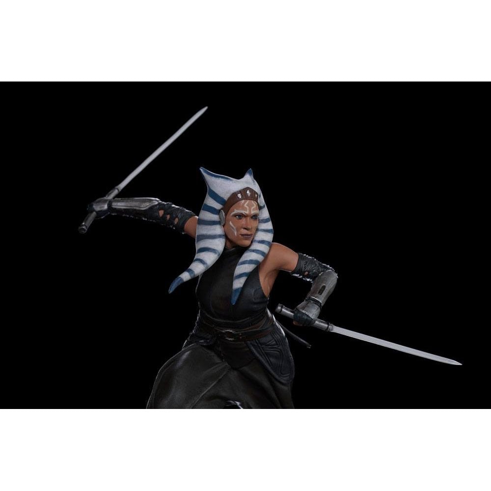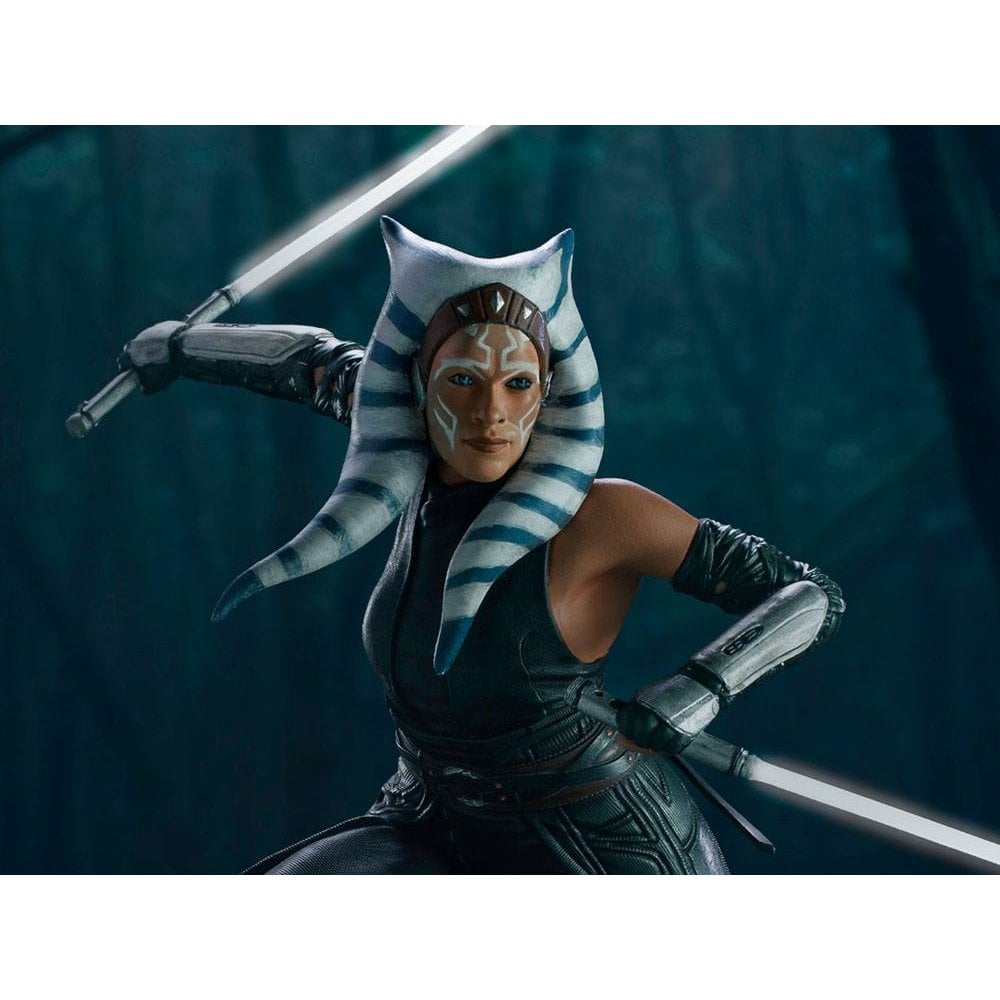 The orange-skinned warrior Togruta is a native of the planet Shili and carrier of the Force. Silent and swift, like a hunting cat, she stealthily moves among the trunks and roots of the forest planet Corvus. Carrying two sabers in each hand, she follows her own ideals of justice and freedom, using all her Jedi training and her long experience in combat, always with the Force. In response to requests from fans and collectors, Iron Studios presents the "Ahsoka Tano - The Mandalorian - BDS Art Scale 1/10" statue, just like the hit series on Disney+.Trained by Anakin Skywalker himself, before he became the villain Darth Vader, Ahsoka does not have official recognition as a Jedi, despite being recognized as such. Created by George Lucas and Dave Filoni and introduced in the Star Wars universe in 2008 through the animated series The Clone Wars, Ahsoka Tano won over fans with her charismatic, rebellious personality, thus consolidating her protagonism in the saga. Played by Rosario Dawson in the second season of the series "The Mandalorian", the character is introduced for the first time in live-action, as her previous appearances have always been in animations such as Star Wars: The Clone Wars and Star Wars Rebels, books and comics. In Chapter 13: The Jedi, now an adult and with long experience, Ahsoka joins forces with Mandalorian bounty hunter Din Djarin (Mando) to free the city of Calodan on the planet Corvus from the tyranny and oppression imposed by imperial magistrate Morgan Elsbeth.Product size: approx. 23 x 16 x 14 cm