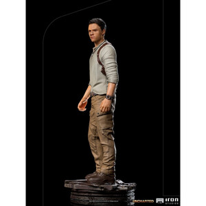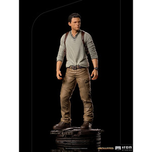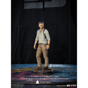 Over a pedestal formed by a pile of wooden debris of an old ship, the young treasure hunter adventurer searches tirelessly for valuable items hidden by the crew of the Portuguese navigator Ferdinand Magellan, but his main search is for his missing brother from whom he was separated as a child. Wearing brown shoes and trousers, his inseparable khaki shirt, an armpit holster, and a necklace with a ring belonging to his ancestor Sir Francis Drake, left under his care by his older brother when they were children, Iron Studios present the statue "Nathan Drake Deluxe - Uncharted Movie - Art Scale 1/10", with theprotagonist hero played by Tom Holland in the cinematographic adaptation of the praised video game franchise.One of the most acclaimed video game series, developed by Naughty Dog and released by SonyInteractive Entertainment, Uncharted presents the adventures of the treasure hunter Nathan Drake, in search of mystic treasures and lost cities, in challenging expeditions where he must face rival hunters and thieves. With important supporting characters, his greatest ally and mentor is Victor "Sully" Sullivan, a veteran treasure hunter. The franchise's success led to its expansion to other media, like novels, comics, and the movie "Uncharted" which shows the career's beginning of the still young Nathan, the descendant of the great explorer Francis Drake. The movie shows his first adventure with Sullivan (Mark Wahlberg), in a dangerous search for a never-found-before treasure in the mystic South American city of El Dorado, taking the young hunter in a perilous mission in many remote places on Earth, facing a group of mercenaries and tracking clues that might lead him to find his long-lost brother. Size: 20 x 9 x 8 cm
