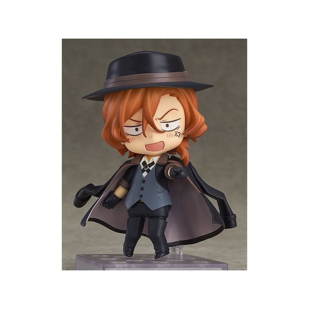 Chuya Nakahara. Ability: "For the Tainted Sorrow".From the anime series 'Bungo Stray Dogs' comes a rerelease of Nendoroid Chuya Nakahara, one of the executives of the Port Mafia that have strong control over the ports! He comes with three face plates including his standard expression, a belligerent combat expression as well as a humiliated angry expression. The long black coat he wears over his shoulders as well as his hat can both be removed for different posing options. Optional parts include his knife to place him in poses that show him off as the strongest martial artist in the Mafia, and he even comes with parts that allow you to pose him with walking pigeon-toed just as Osamu predicted! Be sure to display him with Nendoroid Osamu Dazai (sold separately)!