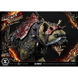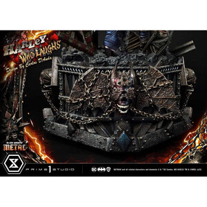"I'm here to play the game, Batman. You think you're the smartest guy in the room, but you're not even close. I'm the punchline you never saw coming." Prime 1 Studio is proud to present this show-stopping addition to the Museum Masterline, here is the incredible 1/3 Scale MMDCMT-13DXS Harley Quinn Who Laughs Deluxe Bonus Version from Dark Nights: Metal! The Multiverse of Darkness harbors many variants of well-known characters from the franchise, but not only heroes are twisted into obscurity. Inspired by DC artist Carlos D'anda's concept of Harley Quinn Who Laughs, Prime 1 Studio brings you this original rendition of the Clown Princess in one of her darkest incarnations. At a whopping 30 inches tall, Harley Quinn Who Laughs is brought to life in her signature red and blue costume, beautifully rendered in metallic and leather textures, a form-fitting ensemble that accentuates her dark allure. The generous use of spikes exudes an air of danger and rebellion, how metal! Her face is encased by an iron caged-style mask, a twisted fusion of metal and darkness that instills fear at its very sight. Alternatively, another swappable head portrait is available for you to display on a headstand, revealing the beautiful face beneath the mask, her peculiar face paint contoured by golden locks. The Queen of Chaos strikes an imposing presence, dark chains in her left hand, holding back her hyenas Bud and Lou. Their eyes gleam with savage hunger and snarling expressions, ready to unleash a brutal and merciless fate upon their prey. She holds a massive meat cleaver that is still dripping with fresh blood. At her feet is a heavy metal ironclad base of pure despair, rubble, chains, blood stains, and skulls, just the right combination to make your skin crawl. The Deluxe Version comes with several swappable parts that will allow you to expand your storytelling and optimize for the perfect display of Harley! We are adding three swappable head parts; two masked variants, and an additional unmasked variant, which all come with their own headstand. Her right-hand weapon can be swapped with a freshly bloodied hammer or a spiked bat. Her left hand can also be swapped for one that is free from the chains, fingers snapping! And when you order the Bonus version from our official store or any authorized distributor, you will receive yet another swappable masked variant head part, one that also comes with a display headstand! Pre-order the MMDCMT-13DXS Harley Quinn Who Laughs Deluxe Bonus Version and add this stunningly gruesome portrayal of the Mistress of Mayhem turned even crazier to your Dark Nights: Metal collection today! Specifications: - Statue Size Approximately 30 inches [H: 78cm W: 44cm D: 51cm] - Statue Size Approximately 30 inches with Hammer [H: 78cm W: 46cm D: 51cm] - Statue Size Approximately 30 inches with Bat [H: 78cm W: 48cm D: 56cm] - Dark Nights Metal Madness-themed Base - Five (5) Swappable head parts - Four (4) display headstands - Three (3) Swappable right-hand parts - Two (2) Swappable left-hand parts - One (1) Swappable Bonus head part [BONUS PART] - One (1) Displayable Bonus headstand [BONUS PART]