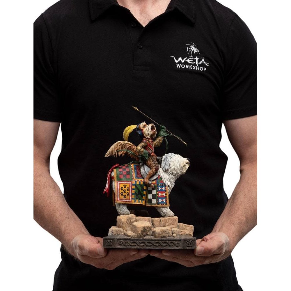 The ominous war helm worn by the Dark Lord Sauron in the Last Alliance of Elves and Men! Decorated to exactly match the worn iron finish of the actual filming prop.Features:- Massive 1/1 scale detailed sculpt of Sauron's Helmet- Full Barad-dûr replica mounting base- LED glowing lava effects- LED Eye of Sauron that can be see through the mask- Dimensions: 30 x 31 x 89 cm- Materials: PolystoneLimited to 7000 pieces.Please note: Due to the size of this item, additional shipping costs may apply. Apart from your location, the actual package size and weight is needed to determine those costs. Both are unknown at this point and may not be available until the product arrives in our warehouse.